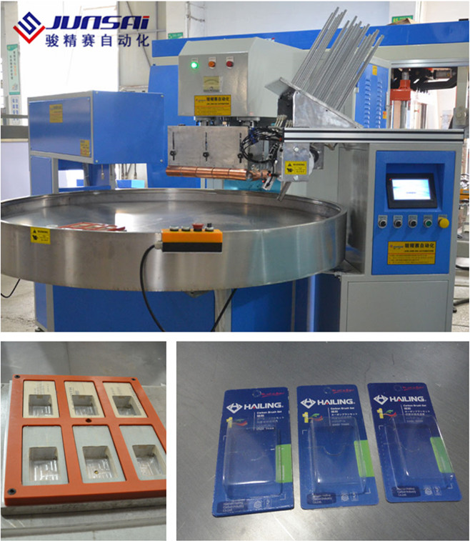 2.      用于吸塑包裝封口的高周波機(jī)器,使用時(shí)可根據(jù)吸塑包裝的產(chǎn)品尺寸大小,來決定一次同時(shí)包裝一個(gè)或多個(gè)產(chǎn)品。工作臺(tái)自動(dòng)旋轉(zhuǎn),3-6工位可選擇,工作效率更高。